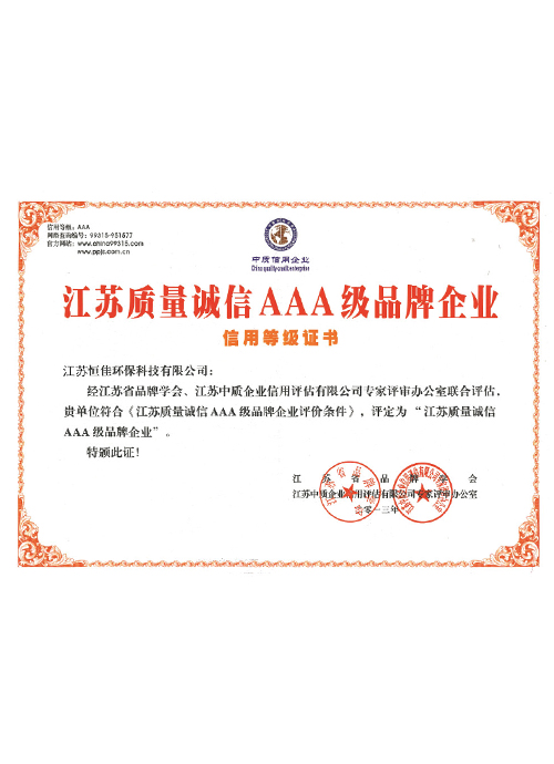 經過多年來的不懈努力,公司已經形成良好的管理和運作體系。獲得了<江蘇質量誠信3a品牌企業>榮譽證書 并已通過ISO9001質理管理體系認證、ISO1400環境管理體系標準及 ISO45001職業健康管理體系標準。